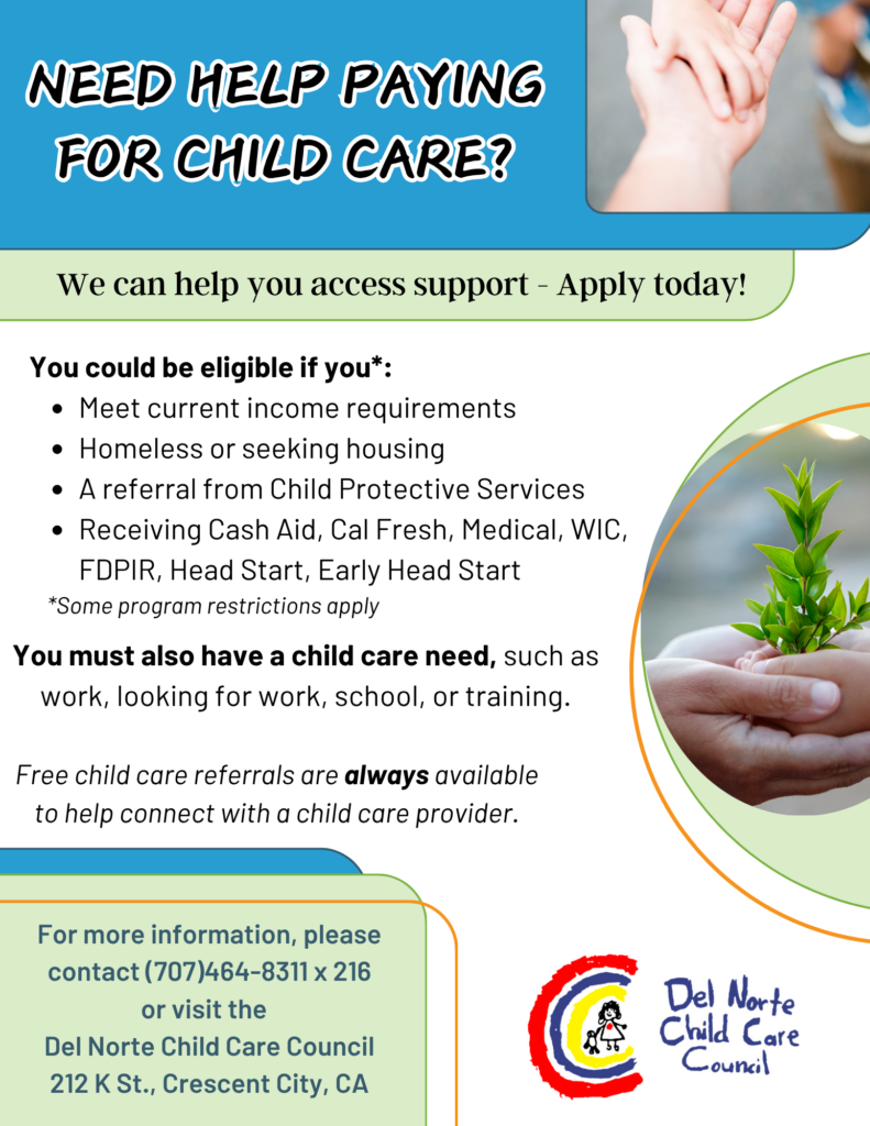 The Alternative Payment Program is a service that pays a portion of child care fees for eligible families with children ages 0-12. Families may qualify based on need, income, and other factors. To apply, fill out the eligibility list application available at the bottom of this page or you may pick up an application at our office at 212 K Street. Interviews are offered as funds become available.